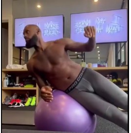 勒布朗詹姆斯赤裸上身,穿着紧身衣训练球迷。并娱乐眼睛